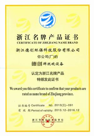 根據浙江名牌戰略推進委員會公告(2013年第1號),公司“德創”牌脫硫設備被評為2013年浙江省名牌產 品。“浙江省名牌產品”這個榮譽的獲得是公司多年來用心經營、重視質量的成果,能提升企業的核心競爭力,提高企業知名度。同時更是一次鞭策,激勵公司進一步夯實質量工作,以科技創新為推力,為客戶創造更優質高效的煙氣治理環保設備。
