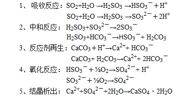 以石灰石粉作為脫硫劑,與工藝水按一定配比混合均勻送入吸收塔底部漿池待用。煙氣從吸收塔的中部進入后轉向上行,進入噴淋段,被噴淋漿液降溫,漿液中的一部分水被蒸發,同時冷卻了煙氣。煙氣中的污染物被漿液吸收,而漿液落入反應池。氧化風機將經過增濕的空氣經攪拌器混合,吹入反應池。氧化和析出反應在反映池內發生,生成石膏晶體。達到一定粒徑要求的石膏晶體漿液經過一級旋流器脫水和二級真空皮帶脫水后,含水率低于10%, 可外售綜合利用。