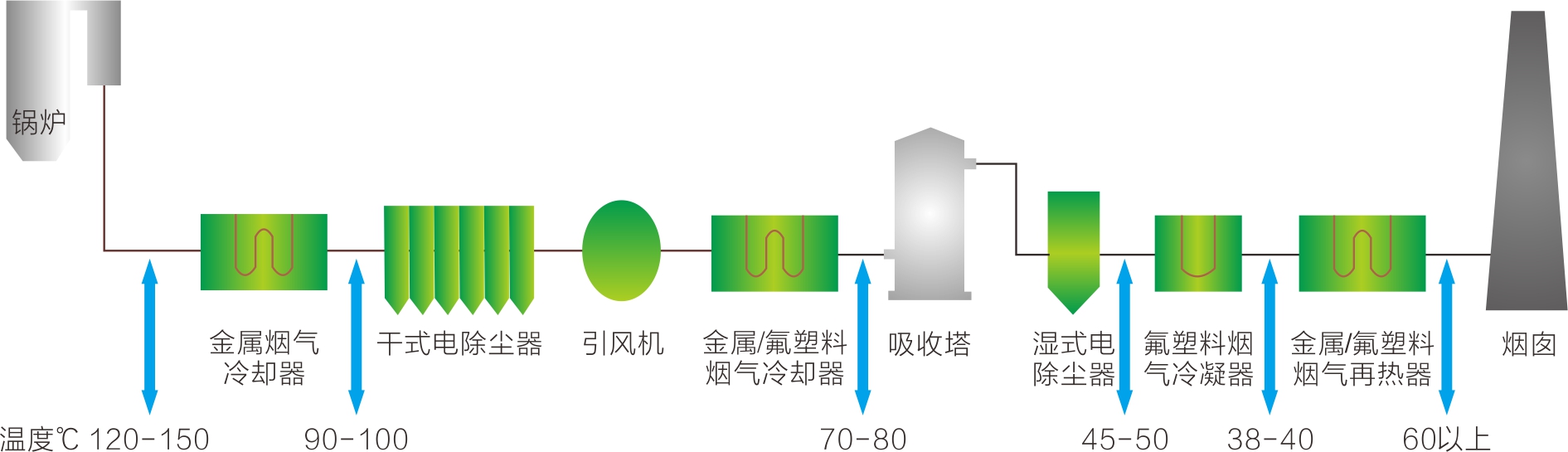 在DGGH實現煙囪入口煙氣再熱的基礎上,在金屬/氟塑料管煙氣再熱器前布置氟塑料煙氣冷凝器,先冷凝析出一定量的水份,將煙氣溫度由45℃-50℃降至38℃-40℃,再通過煙氣再熱器將煙氣溫度抬升至60℃以上,具有節能、節水和消白的效果。