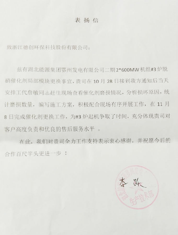 繼10月下旬德創(chuàng)環(huán)保連收兩封表揚(yáng)信后,11月11日,公司再一次收到客戶單位的表揚(yáng)信。此次表揚(yáng)信由湖北能源集團(tuán)鄂州發(fā)電有限公司所寫,主要感謝催化劑事業(yè)部工程服務(wù)部員工詹敏在湖北能源集團(tuán)鄂州發(fā)電有限公司二期2*600MW機(jī)組#3爐脫硝催化劑局部模塊更換工程項(xiàng)目中,能及時(shí)到達(dá)工程現(xiàn)場察看催化劑磨損情況,分析損壞原因,清點(diǎn)磨損數(shù)量,并編寫施工方案,積極配合現(xiàn)場有序開展工作,僅用11天時(shí)間出色完成催化劑更換工作,為#3爐起機(jī)爭取了時(shí)間,充分體現(xiàn)了德創(chuàng)環(huán)保優(yōu)良的售后服務(wù)水平和員工高度負(fù)責(zé)的精神,贏得了客戶方的認(rèn)同與表揚(yáng)。