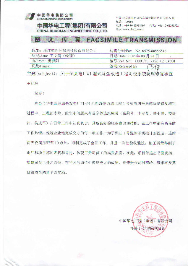 近日,德創環保又一次收到客戶表揚信。在華電國際鄒縣發電廠#1-#4機組濕除改造工程1號濕除陰極系統防腐修復施工過程中,環保工程事業部工程部李嶺、除塵車間顏來有及全體班組成員(張莉芳、李定賢、陸小妹、婁瑞紅、吳成軍)在日常工作中認真負責,具備良好的服務意識和技能,始終保持高昂的工作熱情,兢兢業業完成交辦的每一項工作,為保證1號濕除順利按時投運,連續兩天夜間加班至10點鐘,最終順利完成全部工作,并且實現一次性驗收通過,其施工質量與敬業態度得到了電廠和項目部的表揚和肯定。為此,中國華電工程(集團)有限公司鄒縣1-4#濕除項目部特對李嶺、顏來有及其班組成員予以了表揚。