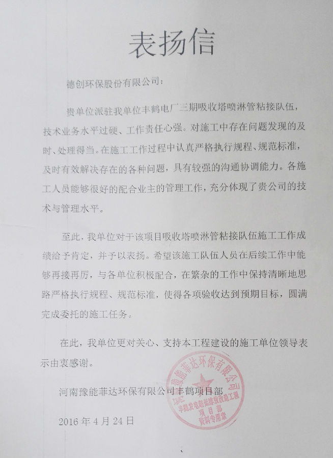 近日,德創(chuàng)環(huán)保收到了來自河南豫能菲達(dá)環(huán)保有限公司豐鶴項(xiàng)目部的表?yè)P(yáng)信。在鶴壁豐鶴2×600MW脫硫項(xiàng)目中,德創(chuàng)環(huán)保派遣的噴淋管安裝人員技術(shù)水平過硬、工作責(zé)任心強(qiáng),能及時(shí)發(fā)現(xiàn)施工中存在的問題并處理得當(dāng),同時(shí)在施工過程中嚴(yán)格執(zhí)行操作規(guī)程,具有較強(qiáng)的溝通協(xié)調(diào)能力,充分體現(xiàn)了德創(chuàng)環(huán)保的技術(shù)與管理水平。對(duì)此,河南豫能菲達(dá)環(huán)保有限公司豐鶴項(xiàng)目部對(duì)德創(chuàng)環(huán)保噴淋管安裝人員予以肯定和表?yè)P(yáng),希望在后續(xù)工作中能再接再厲,使各項(xiàng)驗(yàn)收達(dá)到預(yù)期目標(biāo),圓滿完成委托的施工任務(wù)。