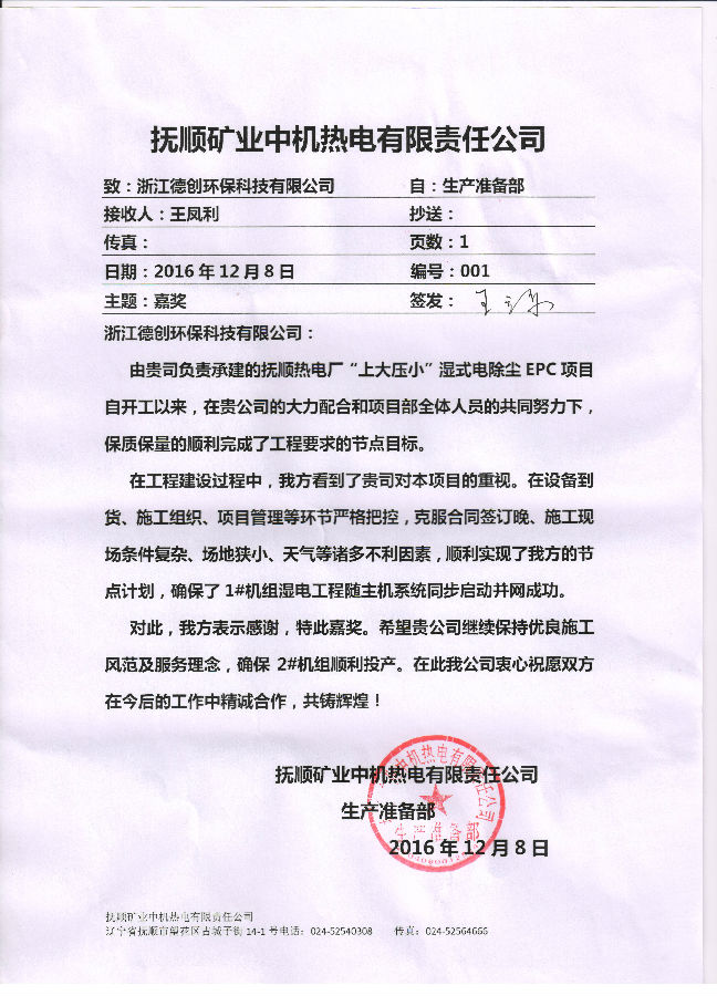 近日,德創(chuàng)環(huán)保收到了一封來自于撫順礦業(yè)中機(jī)熱電有限公司生產(chǎn)準(zhǔn)備部的表揚(yáng)信,信中提及在德創(chuàng)環(huán)保負(fù)責(zé)承接的撫順熱電廠“上大壓小”濕式電除塵器EPC項目自開工以來,在公司的大力配合和項目部全體人員的共同努力下,保質(zhì)保量順利完成了工程要求的節(jié)點目標(biāo)。在工程建設(shè)過程中,德創(chuàng)環(huán)保在設(shè)備到貨、施工組織、項目管理等環(huán)節(jié)能做到嚴(yán)格把控,克服合同簽訂晚、施工現(xiàn)場條件復(fù)雜、場地狹小、天氣等諸多不利因素,順利實現(xiàn)客戶方節(jié)點計劃,確保了1#機(jī)組濕電工程隨主機(jī)系統(tǒng)同步啟動并網(wǎng)成功。對此,客戶方表示感謝,希望德創(chuàng)環(huán)保能繼續(xù)保持優(yōu)良施工風(fēng)范及服務(wù)理念,在接下來的工作中精誠合作,共鑄輝煌。
