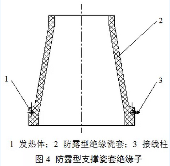 防露型支撐瓷套絕緣子的材料為95瓷,內部裝有發熱體,其結構示意圖如圖4所示。低低溫電除塵器一個供電分區的4個吊點安裝4只防露型支撐瓷套絕緣子。