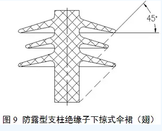 為了更好地防濕,防露型支柱絕緣子的外表面設計成下掠式傘裙(翅),如圖9所示。傘翅下方45°虛線范圍內的表面為雨淋遮蔽面,設計時其展開長度不應小于絕緣子干狀態下的爬電距離。