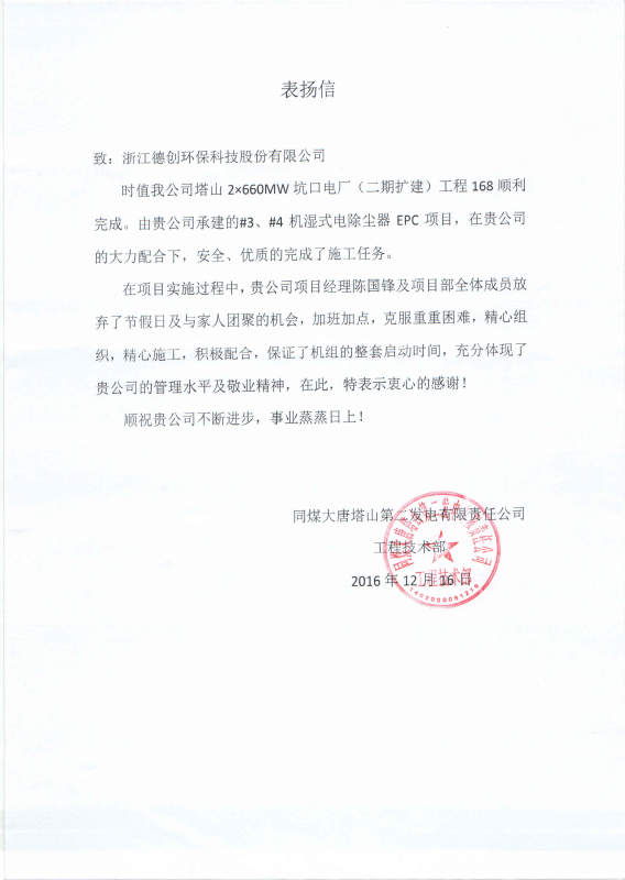 同煤大唐塔山2*660MW坑口電廠(二期擴建)工程168于近日順利完成。為此同煤大唐塔山第二發電有限責任公司特發表揚信,指出由德創環保承建的#3、#4機濕式電除塵器EPC項目,在德創環保員工的大力配合下,安全、優質的完成了施工任務。在實施過程中,公司項目經理陳國鋒及項目部全體成員放棄了節假日與家人團聚的機會,加班加點,克服重重困難,精心組織,精心施工,積極配合,保證了機組的整套啟動時間,充分體現了德創環保的管理水平及敬業精神,對此同煤大唐塔山第二發電有限責任公司特表示衷心的感謝!