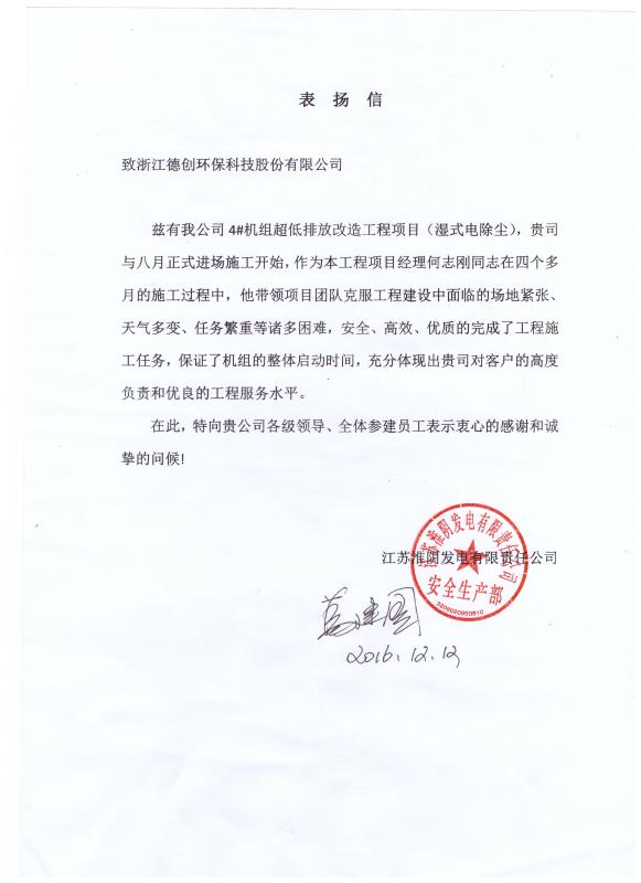 首先是江蘇淮陰發電有限公司發來的表揚信。德創環保于8月份正式進場在江蘇淮陰發電有限公司4#機組超低排放改造工程項目(濕式電除塵)現場,作為工程項目經理何志剛在四個多月的施工過程中,帶領項目團隊克服工程建設中面臨的場地緊張、天氣多變、任務繁重等諸多困難,安全、高效、優質的完成了工程施工任務,保證了機組的整體啟動時間。對此,江蘇淮陰發電有限公司對德創環保的高度負責與優良的工程服務水平予以肯定。