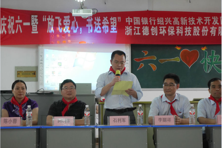 6月1日,慶祝六一暨“放飛愛心 書送希望”中國銀行紹興高新支行與德創環保圖書捐贈儀式在紹興新橋小學舉行。德創環保總裁辦經理石利軍、行政管理中心經理陳棟出席儀式。此次捐贈,德創環保與中國銀行高新支行在六一兒童節這個特殊的節日里,為小朋友們捐贈各類圖書,奉上一份希望與愛心。