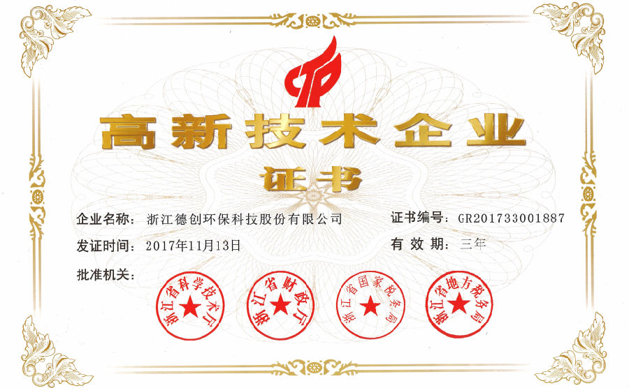 1月11日,德創環保收到浙江省科學技術廳、浙江省財政廳、浙江省國家稅務局和浙江省地方稅務局聯合頒發的《高新技術企業證書》。