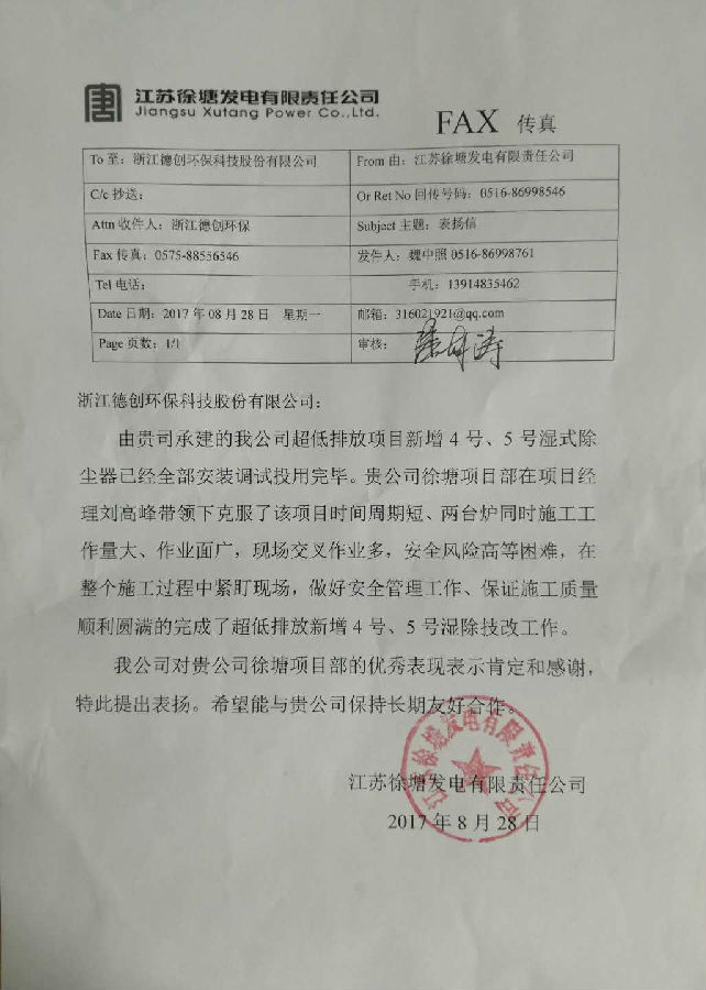 近期,德創(chuàng)環(huán)保收到了一封來自江蘇徐塘發(fā)電有限責(zé)任公司的表?yè)P(yáng)信。德創(chuàng)環(huán)保在徐塘超低排放項(xiàng)目新增的4號(hào)、5號(hào)濕式除塵器已全部安裝調(diào)試完畢,施工人員在我公司徐塘項(xiàng)目部經(jīng)理劉高峰帶領(lǐng)下克服了該項(xiàng)目時(shí)間短、工作量大、現(xiàn)場(chǎng)交叉作業(yè)多等困難。在整個(gè)施工過程中德創(chuàng)環(huán)保緊盯現(xiàn)場(chǎng),做好安全管理工作、保證施工質(zhì)量并圓滿完成了超低排放新增4號(hào)、5號(hào)濕除技改工作。在此業(yè)主方予以了表?yè)P(yáng)與感謝。