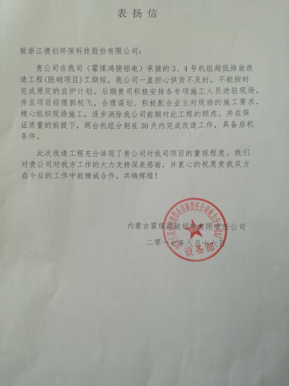 近日,德創環保喜收來自內蒙古霍煤鴻駿鋁電有限責任公司業主的表揚信。德創環保承接的霍煤鴻駿鋁電3、4號機組脫硝項目工期短、時間緊,業主一直擔心難以按時完成原定的起爐計劃,工程開工后德創環保積極安排各專項人員進場,合理安排組織施工,在保質保量的前提下,在30天內完成了兩臺機組的改造工作,具備啟機條件,受到了業主的大力稱贊。