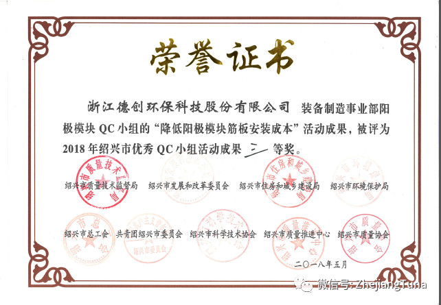 近日,紹興市質量協會舉辦的2018年紹興優秀質量管理小組(QC小組)活動評選中,德創環保獲三項佳績!