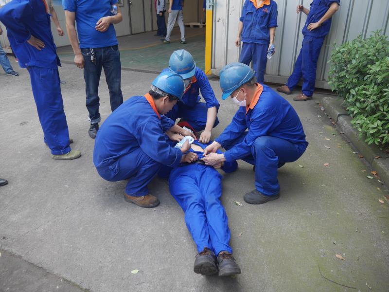 高溫酷暑天來臨,考慮到車間一線員工易發(fā)生中暑現(xiàn)象,特設(shè)置“中暑休克急救”環(huán)節(jié)。當(dāng)出現(xiàn)這種狀況,首先將中暑者快速抬離高溫區(qū),在通風(fēng)處,立即脫去上衣并用帶酒精的毛巾為其擦拭身體降溫。