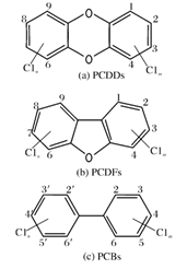二噁英是一類物質的總稱,包括多氯聯苯并二噁英(PCDDs)、多氯聯苯并呋喃(PCDFs)和多氯聯苯(PCBs),其結構如圖1。一般情況下,把前兩類物質簡稱為二噁英(PCDD/Fs),根據氯原子取代數目及取代位置的不同,它們分別含有75種和135種同系物。該類物質化學性質非常穩定,熔點高,極難溶于水和酸堿,可溶于大部分的有機溶劑,是無色無味的脂溶性物質。