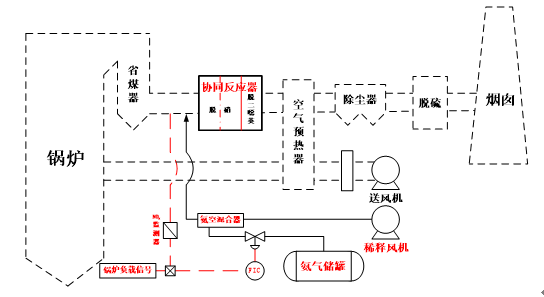 本系統組成如圖6所示。主要包括氨儲存制備供應系統、氨噴射系統、連接煙氣系統、吹灰系統、協同反應器、脫硝催化劑和脫二噁英催化劑等。