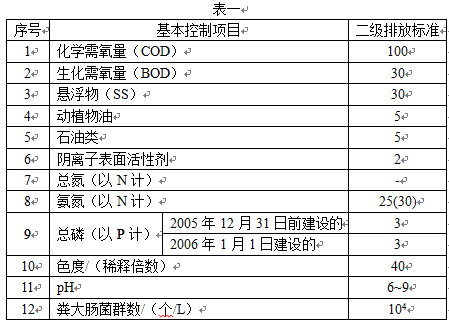 新疆所建的城市污水處理廠大多數設計出水水質為《城鎮污水處理廠污染物排放標準》(GB18918-2002)中的二級標準,具體水質指標如表一。