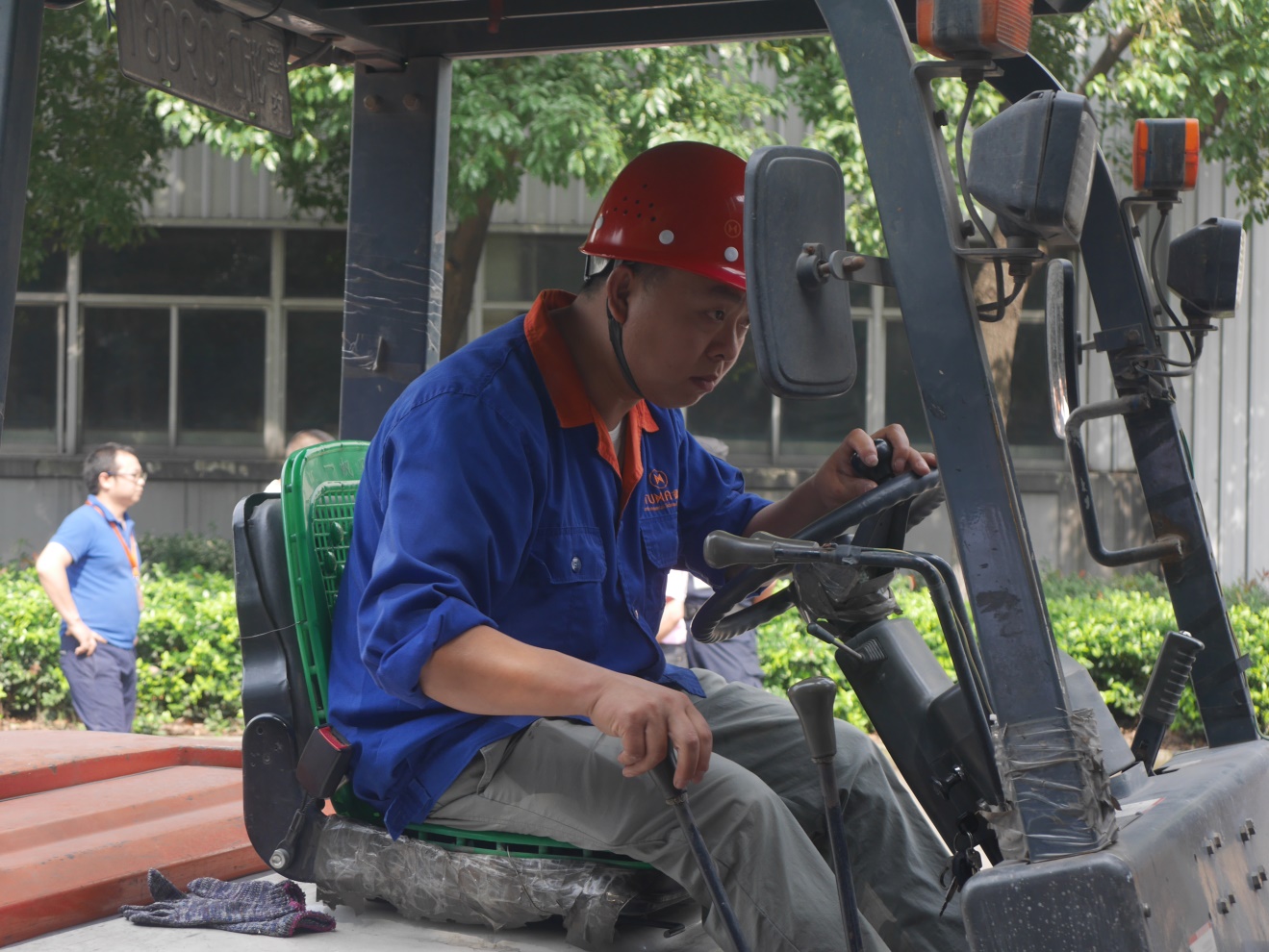 比賽第一個項目是“繞桿”,比賽場地上設置3個障礙物,叉車在走“s型曲線”的同時,要保持放在車頭的水瓶不倒,否則減分,這對本身就震動劇烈的叉車還是有難度的,這考驗的是叉車司機對叉車行駛的掌控性。繞過障礙物后就來到下一關“瓶口碼水球”,叉車首先到掛有水球的架子前,用一開始綁在車頭的筷子取下水球,然后把它放在瓶口上,如何讓如此龐大笨重的車身與小球配合有度,這非常考驗叉車司機的駕駛技術以及對叉車準度、精度的掌控。每位選手都聚精會神地盯著車頭那根筷子,一旦有碰桿和堆放不穩的情況,立即打起精神調整操作。