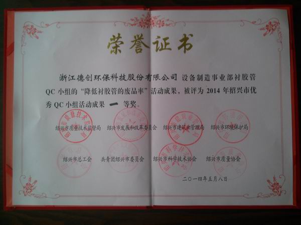 熱烈祝賀由公司包飛華同志完成的設(shè)備制造事業(yè)部襯膠管QC小組的“降低襯膠管的廢品率”被評(píng)為2014年紹興市優(yōu)秀QC小組活動(dòng)成果一等獎(jiǎng),特此報(bào)告 !